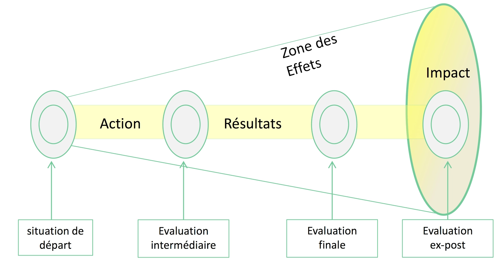 - L’impact est le changement final à la suite d’une action. Prévoir un impact est plus difficile que la prévision des effets car plusieurs facteurs extérieurs au projet interviennent. Le temps est un facteur car l’impact se juge ex-post, à terme (Il faut attendre “après” la fin du projet puis revenir plus tard pour pouvoir évaluer l’impact)