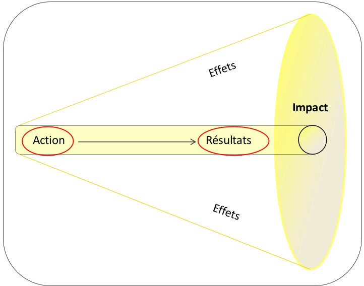 - Impact : ensemble des changements significatifs et durables, positifs et négatifs, prévus ou imprévus, sur les personnes, les groupes et leur environnement, ayant un lien de causalité avec l’action.
