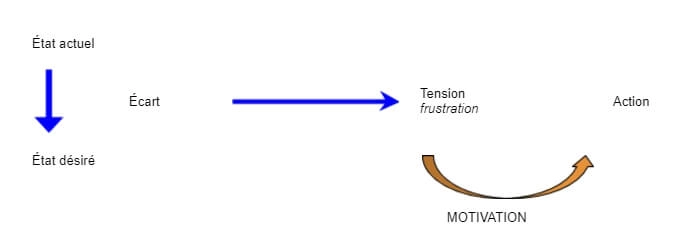 La motivation arrive quand on a un écart entre l’état actuel de la personne et l’état qu’elle désire.Cet écart va créer une tension psychologique, une frustration qui va la pousser à l’action.