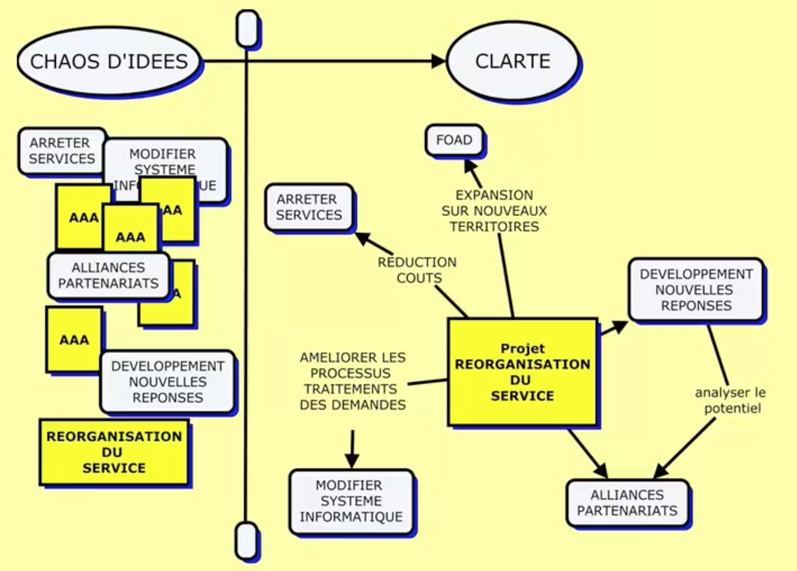 Le chaos d’idées par lequel débute tout projet peut s’organiser sous forme d’arborescence. Il donne une carte sur laquelle on peut préciser la nature des relations entre les idées par une étiquette sur la flèche reliant deux concepts. le passage de gauche à droite (chaos d’idées à clarté) est matérialisé par une ligne frontière. La discussion pour aboutir à un classement est l’objet de transactions entre participants pour aboutir à la clarté, ordre qui convient à toutes les parties prenantes du projet. Leur vision individuelle devient une vision partagée. Elle sera d’autant plus engageante que les idées de chacun sont analysées et retenues ou pas selon le résultat des négociations internes au groupe.