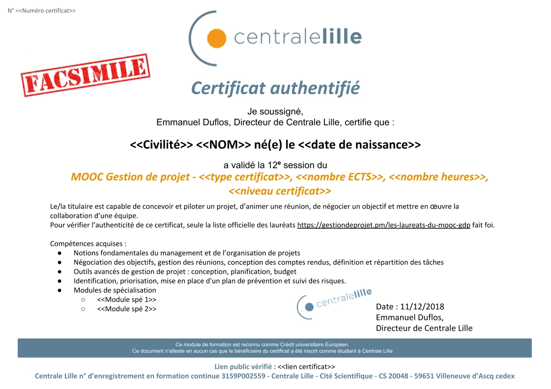 Le formulaire de demande est publié sur le fil de discussion du MOOC : Cours > Bienvenue dans le MOOC GdP > Attestations, certifications & examens > Certification authentifiée – Examen surveillé par Smartphone,